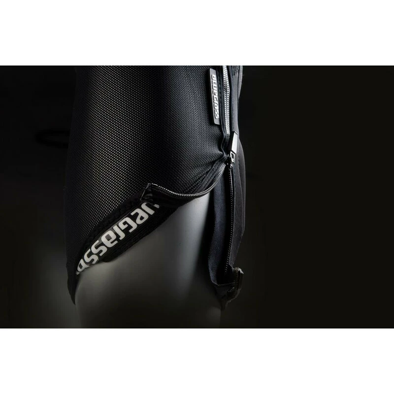 Der Solid Protektor der Marke Bluegrass ist zusätzlich zu den üblichen Polstern noch mit D3O® Einsätzen verstärkt. D3O® Material bleibt im Normalzustand flexibel – bei Krafteinwirkung verhärtet sich das Material jedoch im Bruchteil einer Sekunde und leitet die Stosskraft nach aussen ab. Dank des Reissverschlusses kann der Protektor ganz einfach angelegt werden und durch die integrierten Silikoneinsätze gibt es kein Verrutschen. An besonders gefährdeten Stellen besteht der Protektor aus Kevlar.