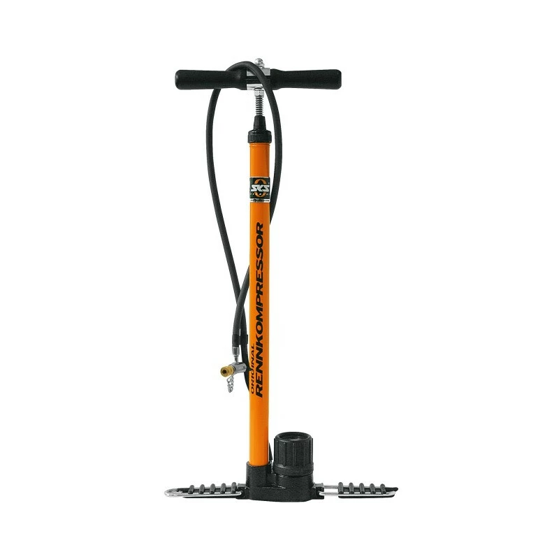 Der RENNKOMPRESSOR ist seit mehr als 50 Jahren die beliebteste Pumpe des internationalen Radsports und der einzig legitime Vater aller Standpumpen. Das massive Metallrohr, der Gusseisenfuss, das Präzsionsmanometer sowie der schwarze Holzgriff zeugen von bester Qualität „Made in Germany“. Die Füsse sind einklappbar und erleichtern den Transport. Die Standpumpe wird in authentischem SKS Orange ausgeliefert und ist optional mit drei verschiedenen Ventilanschlüssen, wie E.V.A., MULTI VALVE und Messingnippel erhältlich. Der Druckmacher pumpt bis zu 16 bar/230 psi in die Fahrrad-Reifen.
